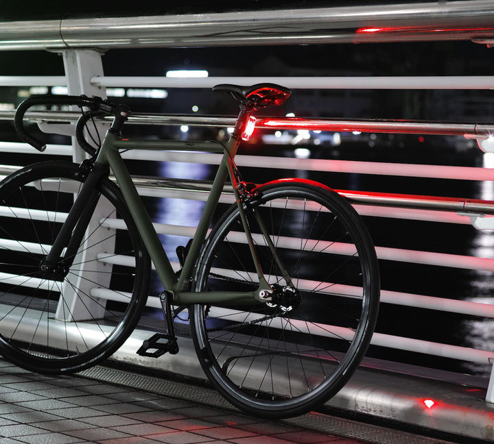 In addition to the auto mode that automatically turns on the light by vibration/light/darkness sensor, the brake light emits a strong light by detecting "G-force" when braking. This light notifies the braking backwards and supports a safer ride.